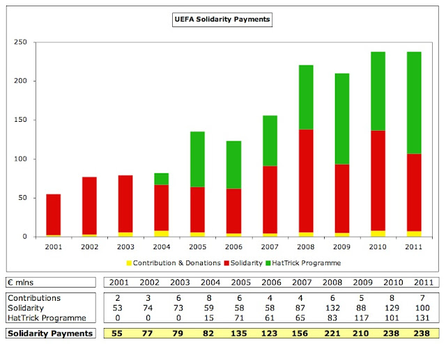 To be fair to UEFA, although this is small beer, they have been increasing solidarity payments in line with revenue growth, rising from €55 million in 2001 to €156 million in 2007 and €238 million in 2011, but they are still significantly lower than the distribution payments made to the elite clubs involved in the Champions League.