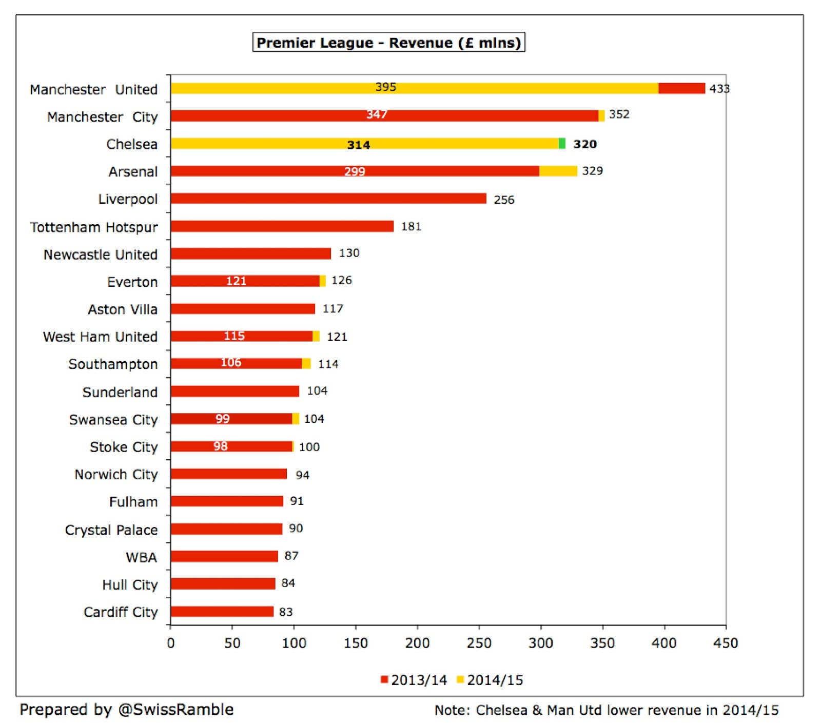 Chelsea’s 2013/14 revenue of £324 million (based on the holding company accounts) placed them 7th highest in world football as per the Deloitte Money League, though Real Madrid continued to lead the way with £460 million, followed by Manchester United £433 million, Bayern Munich £408 million, Barcelona £405 million and Paris Saint-Germain £397 million.
