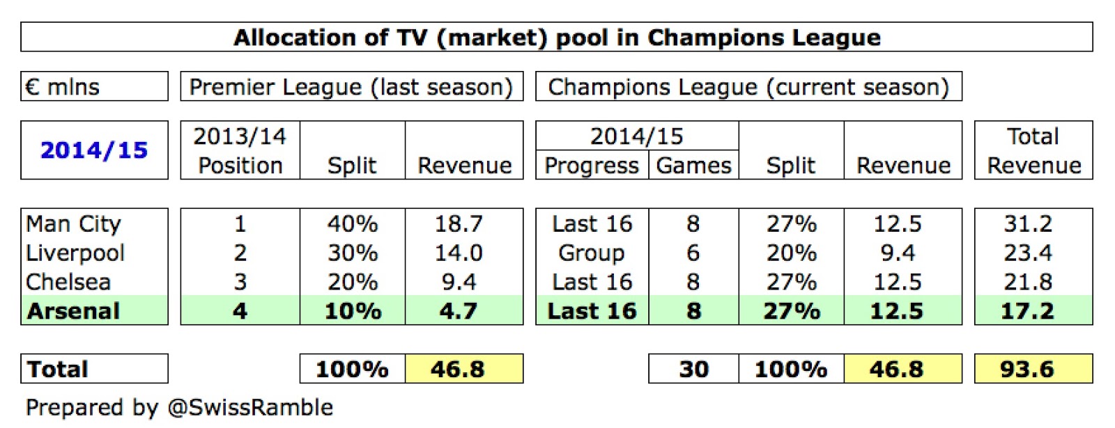 The market pool is also significantly higher, thanks to BT Sports paying more than Sky/ITV for live games. Arsenal’s 2015/16 payment will partly depend on how far they progress in this season’s Champions League, but also how well the other English clubs do, so if City and Chelsea get past the last 16, Arsenal will receive a smaller share for this element than 2014/15.