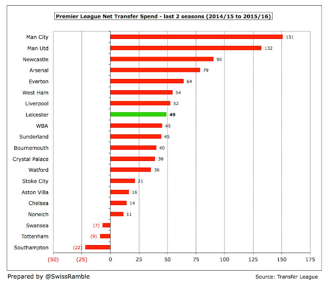 Since their return to the top flight, Leicester have obviously increased their expenditure, splashing out £55 million (£49 million net) in the last two seasons. Some of this is on younger players with an eye to the future, e.g. Demarai Gray from Birmingham City and Daniel Amartey from FC Copenhagen.