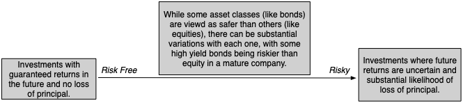 I. Risk falls on a continuum: Risk is not an on-off switch, where some assets are risky and others are not. Instead, it is better to think of it on a continuum, with investments with very little or close to no risk at one extreme (riskless) to extraordinarily risky investments at the other.